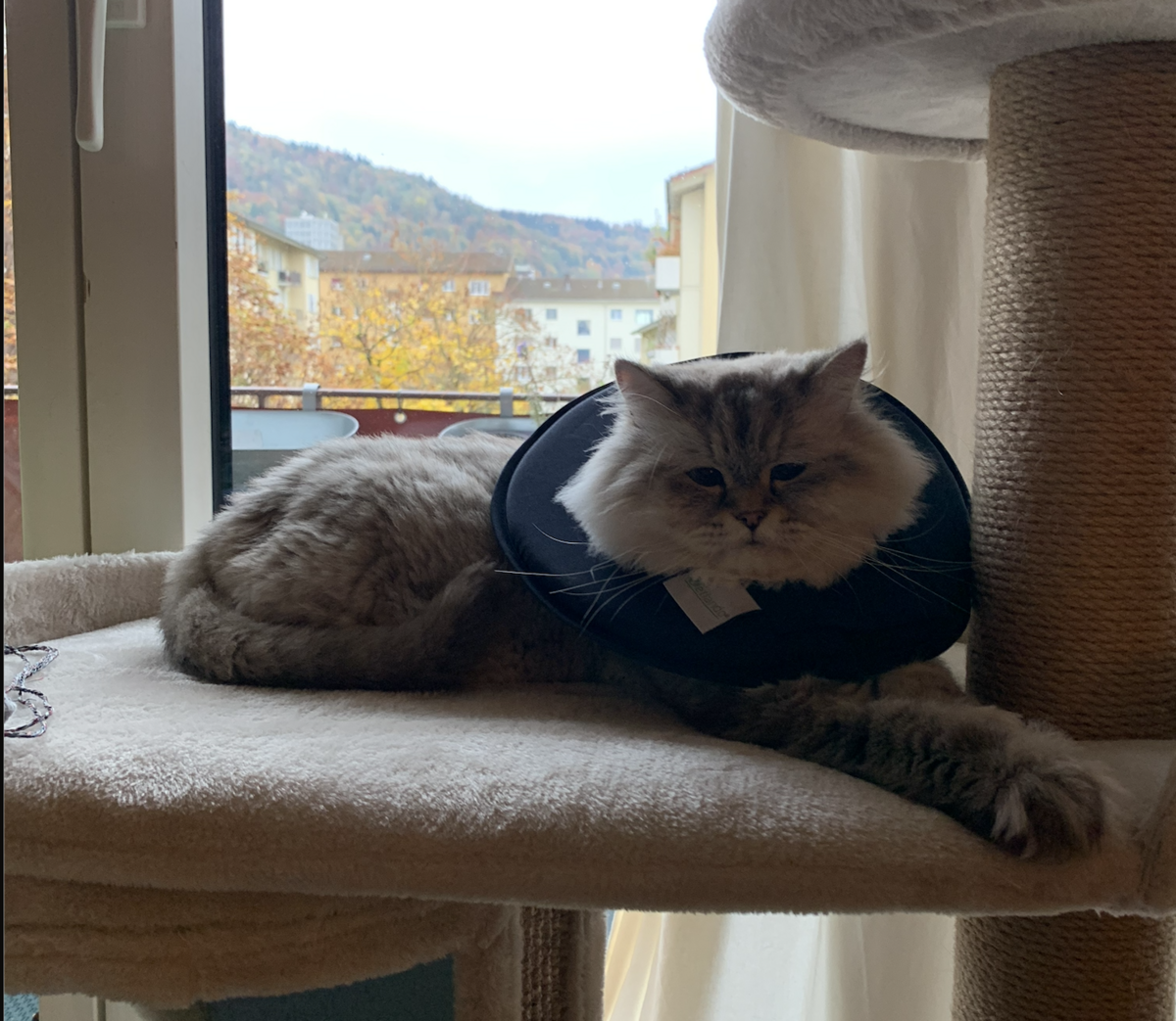 Kurz darauf durfte er auf seine Pflegestelle bei Nora ziehen – endlich raus aus der Transportbox, hinein in eine liebevolle Umgebung. Schon nach wenigen Sekunden begann Max, die Wohnung zu erkunden. Er rollte sich auf den Boden, schnupperte an allem und bearbeitete den Teppich mit seinen Krallen. Nur die Halskrause fand er ziemlich überflüssig – aber wer könnte ihm das verdenken?
